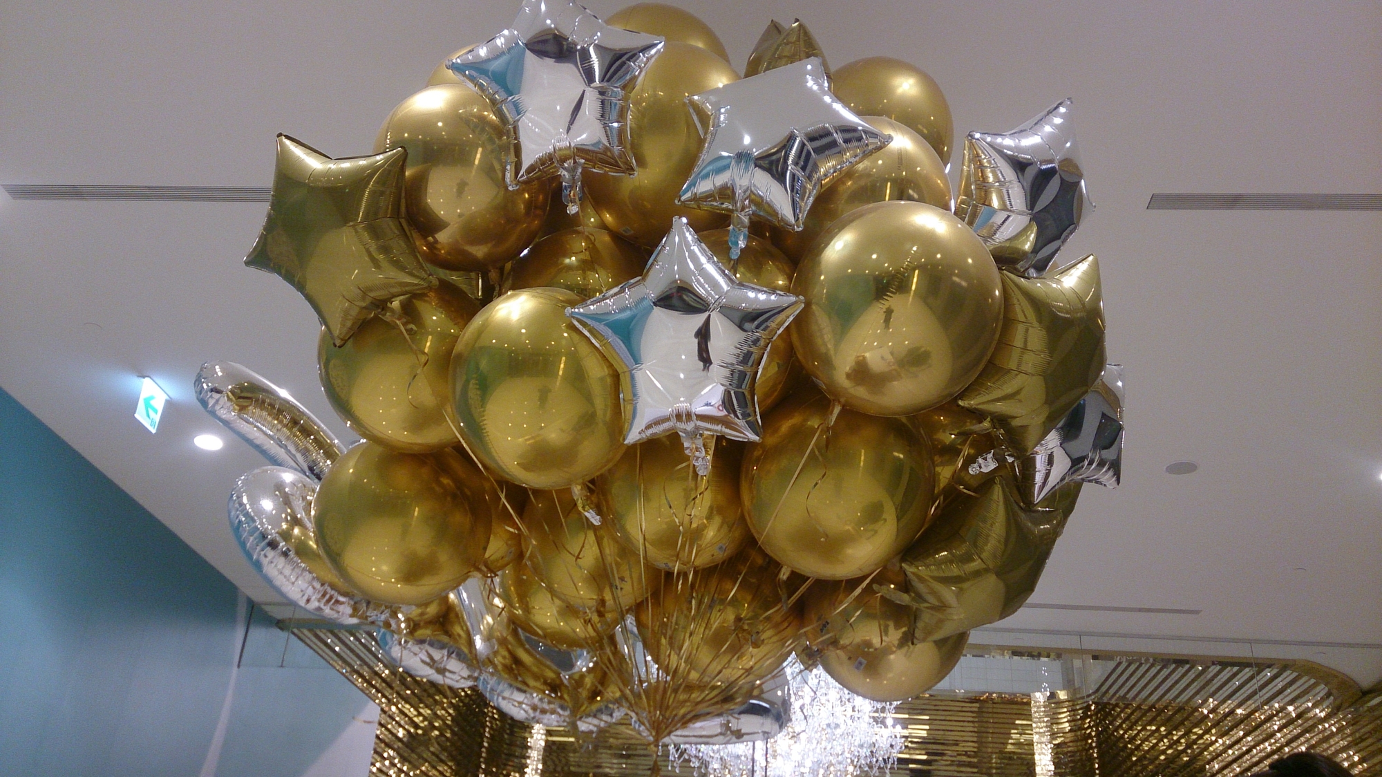 像照片中紅色的星形的鋁箔球是日本進口的,無論是品質、色澤的飽和鮮豔度都與對岸進口的氣球有非常大的不同。