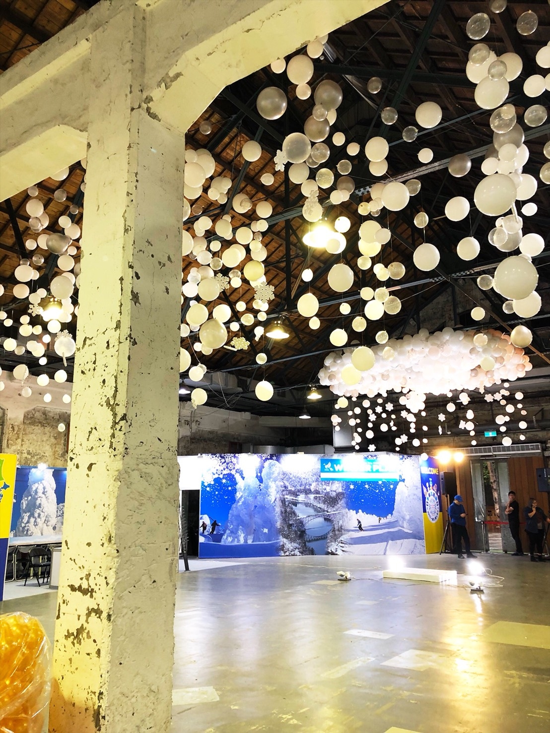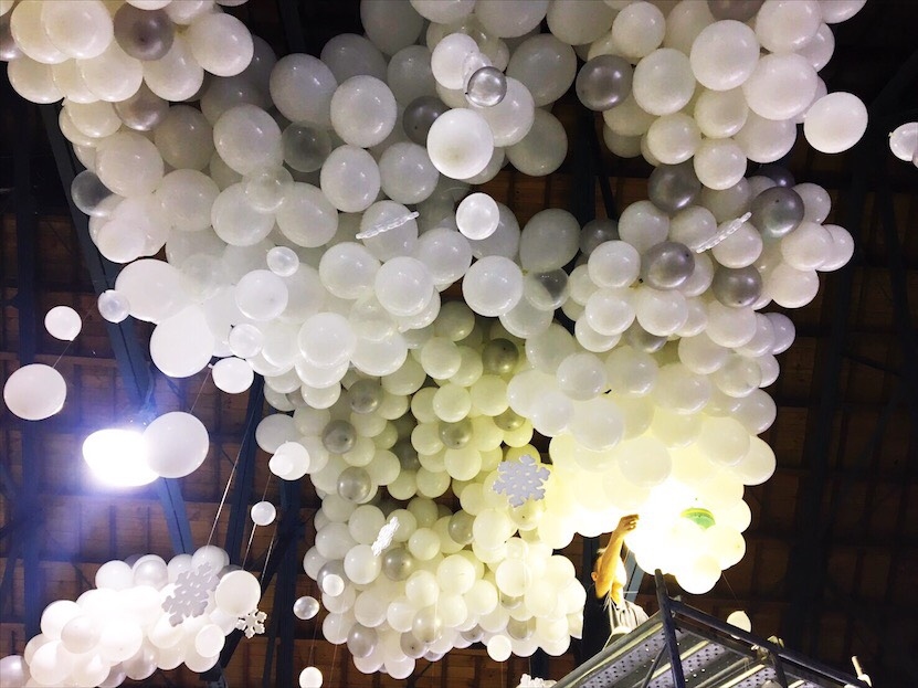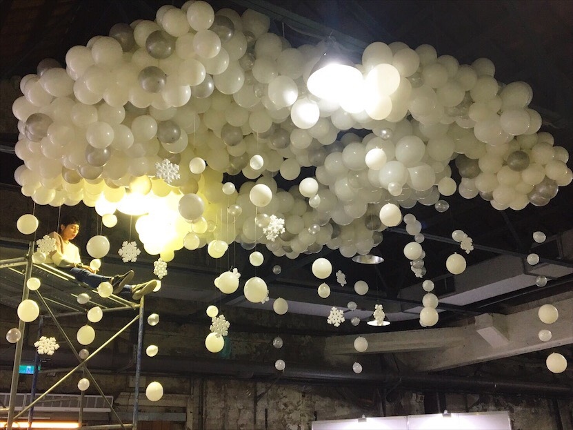12/7這個禮拜我們接受了日本公司的委託,在華山文創的光合箱子作展場的會場佈置,在數百坪的空間內,使用了數千顆氣球做高空的懸吊作業,這次的主題呈現在於冬日的日本九州,雲、雪花為這次的主題,帶來了冰天雪地的美景。